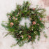 Moss-based wreath with green foliage, decorated with seasonal trimmings.