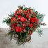 Luxurious mix of reds including roses, ranunculi and anemones.