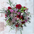 Featuring velvety red roses at its heart, this exquisite arrangement is adorned with soft mauve hues of seasonal hellebore, delicate clematis, ethereal astrantia, and feathery astilbe. Lush foliage weaves through the design, evoking a natural, enchanting allure.