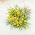 Sculptural craspedia and sweet scented mimosa with brunia flower arrangement. According to seasonal availability.
